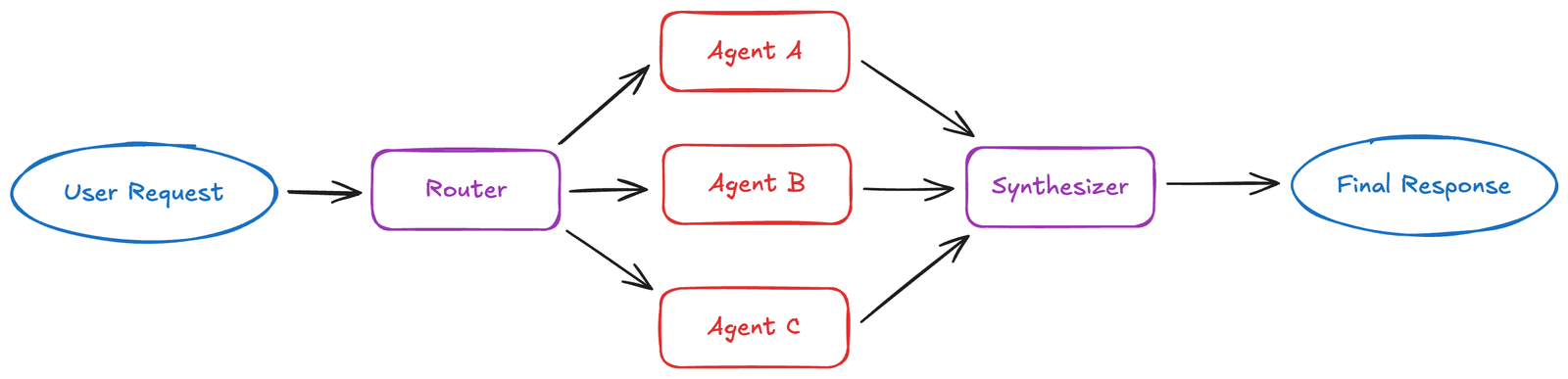 通过一个 Router Agent 对请求进行分类或拆解,并将子任务 并行分发 给多个专用 Agent,并对返回的结果进行综合。