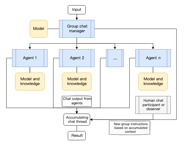 类似于人类的团队会议,通过多轮对话和讨论来共同解决问题。通常需要一个“管理员”来引导流程。
