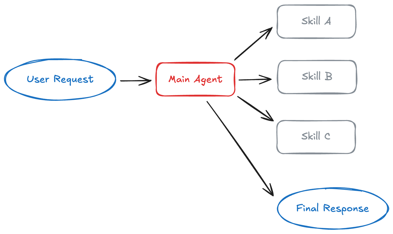不是严格意义上的多智能体,而是一个智能体根据任务动态加载不同“技能包(Skill)”,这些技能包封装了特定能力的提示、指令和资源。