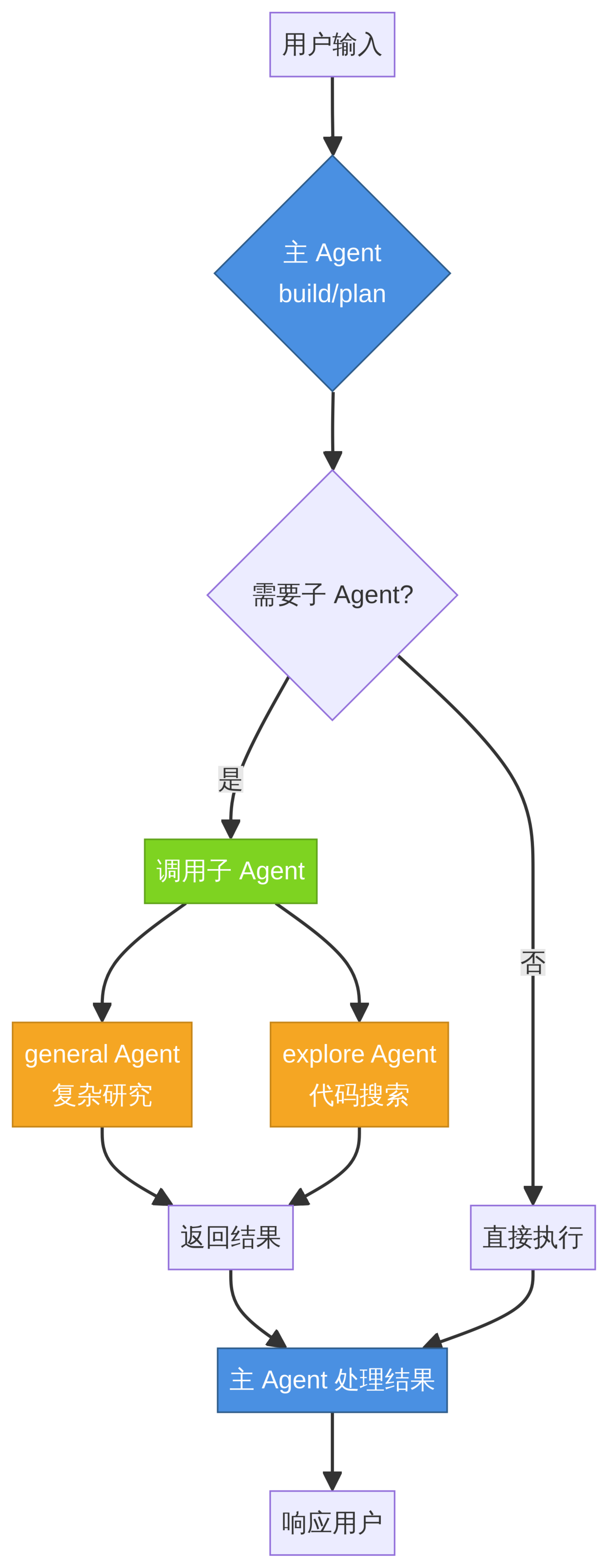 generalAgent 用于处理复杂的多步研究任务,而exploreAgent 则专注于快速的代码库搜索。这些子 Agent 在被调用时执行特定任务,但本身不维护长期状态,其生命周期由主 Agent 完全控制。