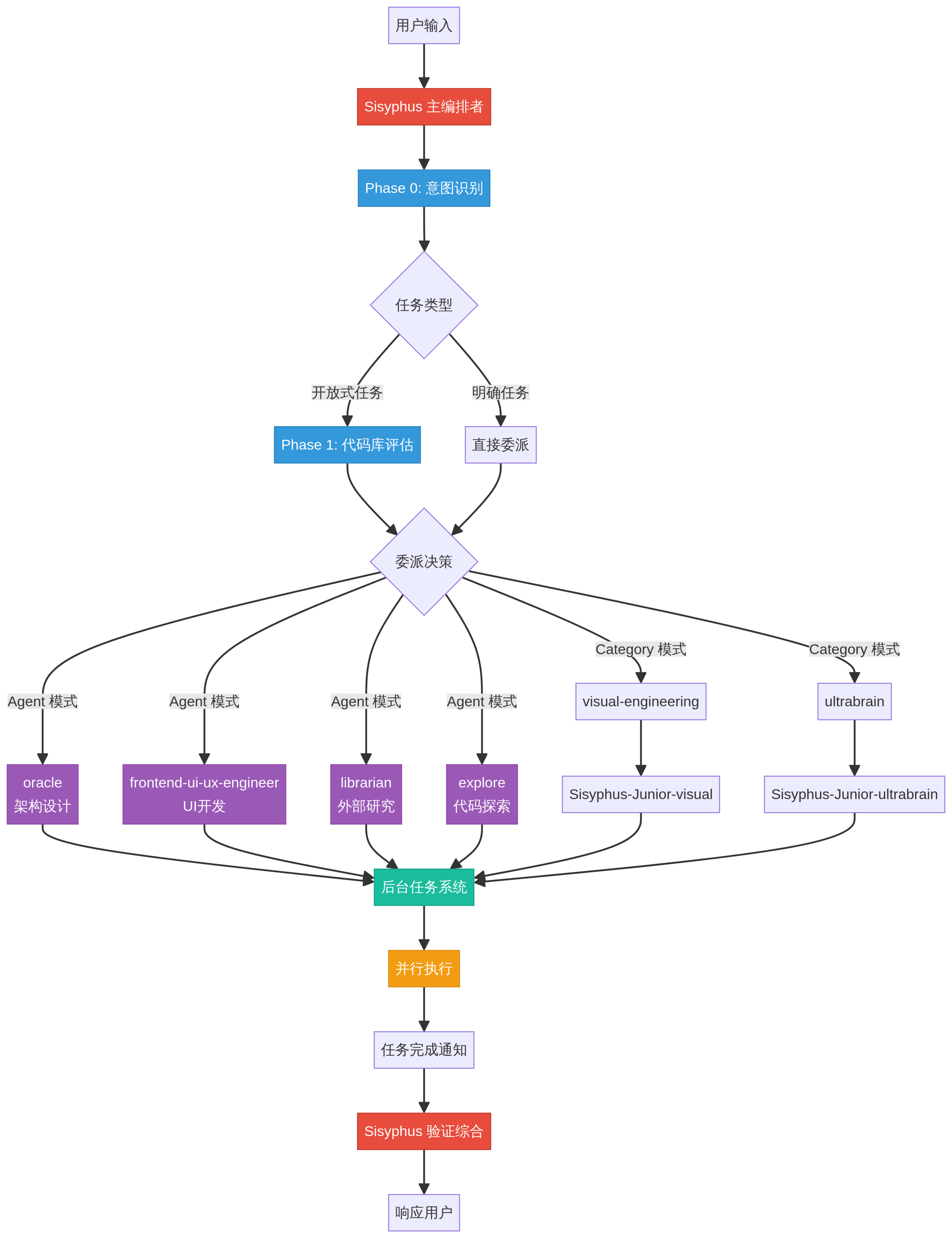 Oh My OpenCode 的核心是名为 Sisyphus 的主编排 Agent。它的角色不再是亲力亲为的执行者,而是一位经验丰富的“技术主管”或“架构师”。其核心职责是理解用户意图、分解复杂任务,并将其委派给最合适的专家 Agent。Sisyphus 的工作流程被设计为多阶段的决策过程: